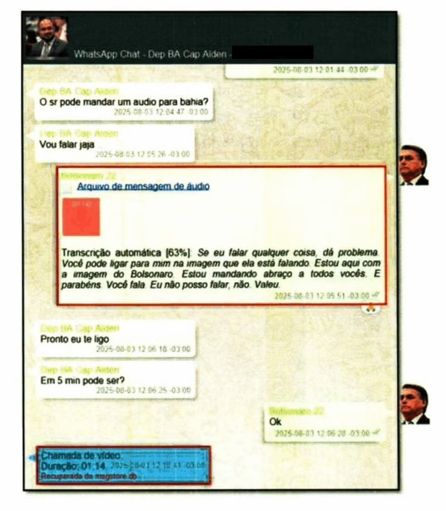 A conversa ocorreu por WhatsApp durante manifestação em Salvador, em 3 de agosto — poucos dias após Bolsonaro ser alvo de medidas cautelares do STF, como uso da tornozeleira, proibição de redes sociais e recolhimento domiciliar.