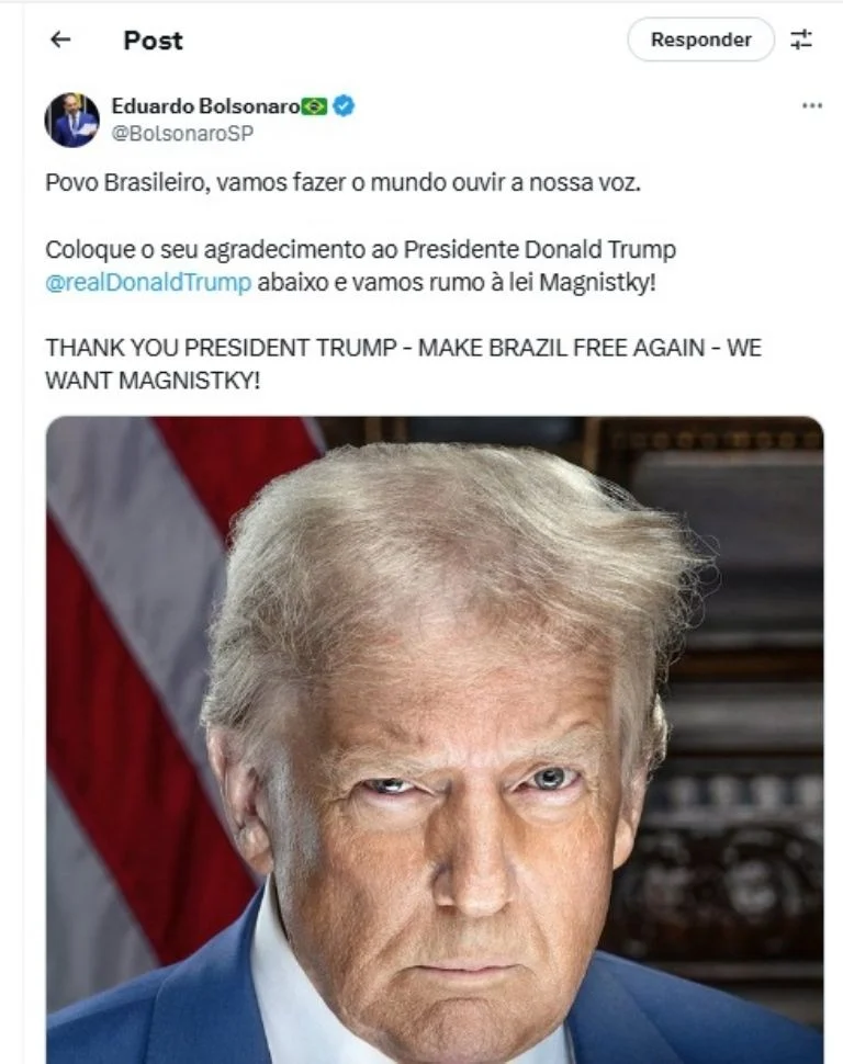 O deputado, atualmente morando nos EUA, fez publicamente a celebração da sanção econômica — e ainda celebrou sua parceria ideológica com Trump. Ecoa uma narrativa de vitória internacional em detrimento do próprio país.