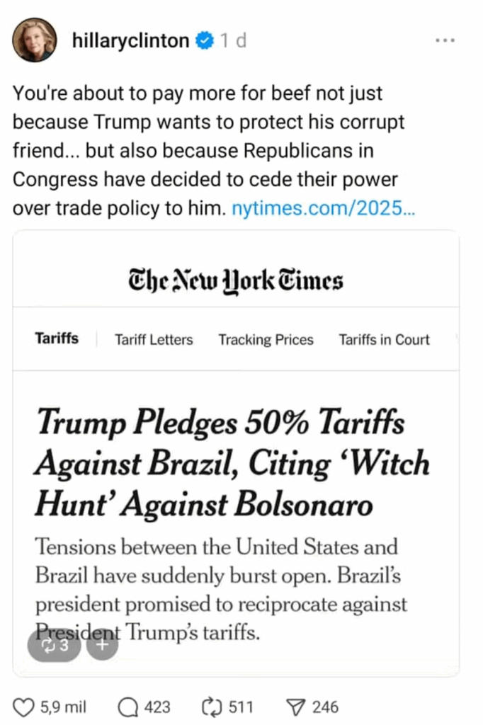 Hillary usou a rede social Threads para expor o que está por trás do discurso oficial: a alta tarifária não é sobre economia, mas sobre proteger um “amigo corrupto”. Ela afirma que a conta será paga pelos consumidores americanos, por causa do poder extraordinário que Trump e a bancada republicana cederam a suas decisões de política comercial.