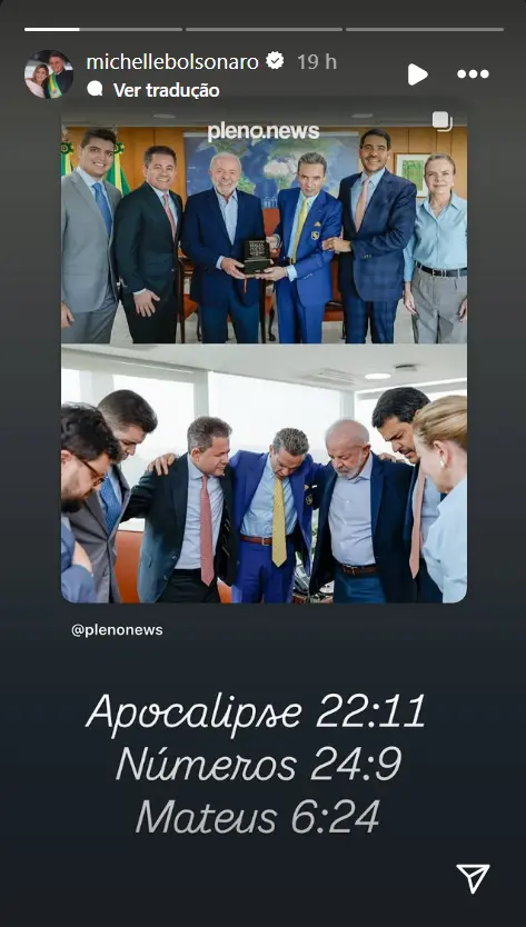 Michelle Bolsonaro reagiu à foto divulgada do encontro entre o presidente Lula, o advogado-geral da União Jorge Messias e lideranças evangélicas, usando referências bíblicas como forma de protesto. Nos Stories de seu perfil no Instagram, ela compartilhou a imagem com três versículos: “Apocalipse 22:11, Números 24:9, Mateus 6:24”.