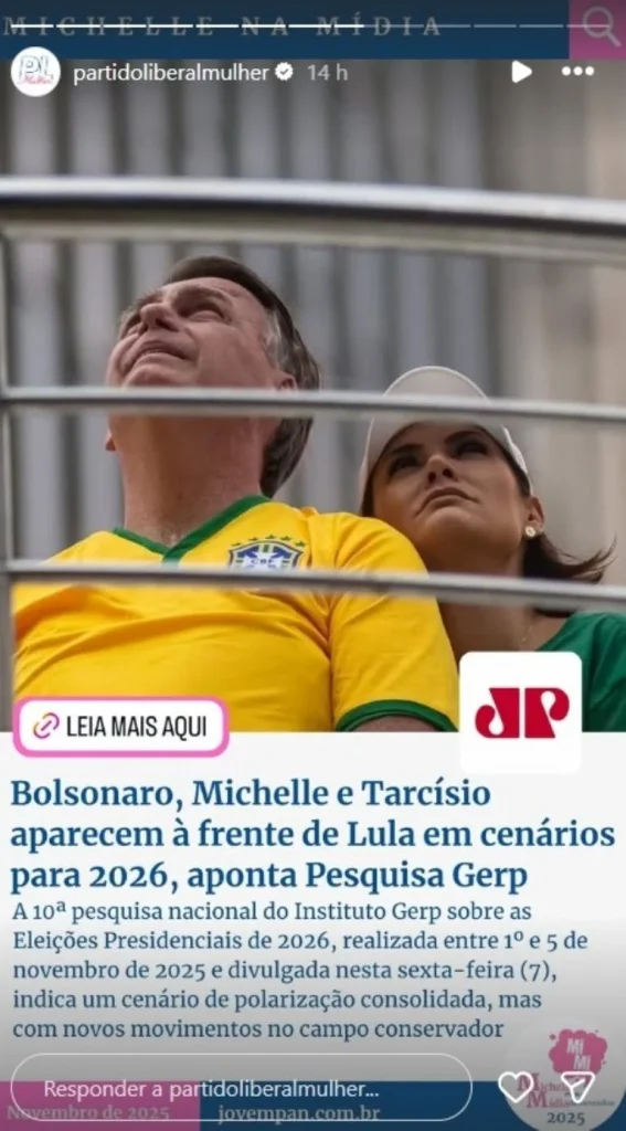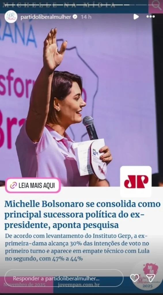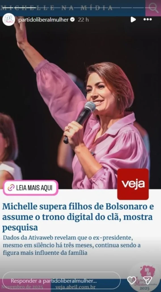 Foi nesse cenário que Michelle entrou em cena. Segundo a reportagem, a ex-primeira-dama flodou seu perfil nas redes sociais com conteúdos em que se coloca como guardadora do “legado” de Bolsonaro, reforçando a imagem de esposa leal, líder religiosa e figura “pura” para falar com o eleitorado conservador e evangélico. As publicações trazem referências diretas ao marido preso, mensagens de fé e insinuações de que caberia a ela conduzir o projeto político do clã.